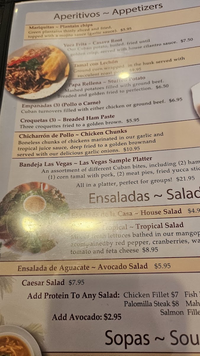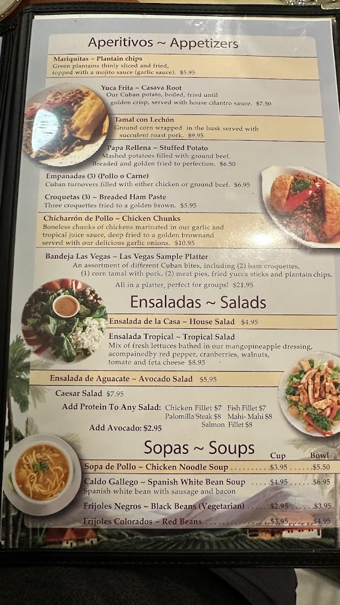 Welcome to Las Vegas Cuban Cuisine, a hidden gem on E Oakland Park Blvd in Fort Lauderdale. This restaurant is a delightful escape into the heart of authentic Cuban flavors, where each dish showcases the pride and passion of its staff. The menu presents an array of vibrant salads like the Ensalada Tropical, featuring fresh lettuces paired with a delightful mango-pineapple dressing, and the classic Avocada Salad for just $5.95. Families will love the Kid's Menu, offering hearty options like the Baby Palomilla and chicken fingers.